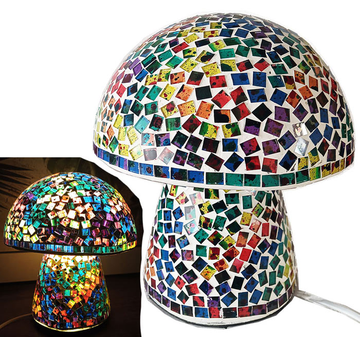 • Lampa została wykonana z dziesiątek małych szkiełek zatopionych w ceramicznej masie w kształcie grzyba.