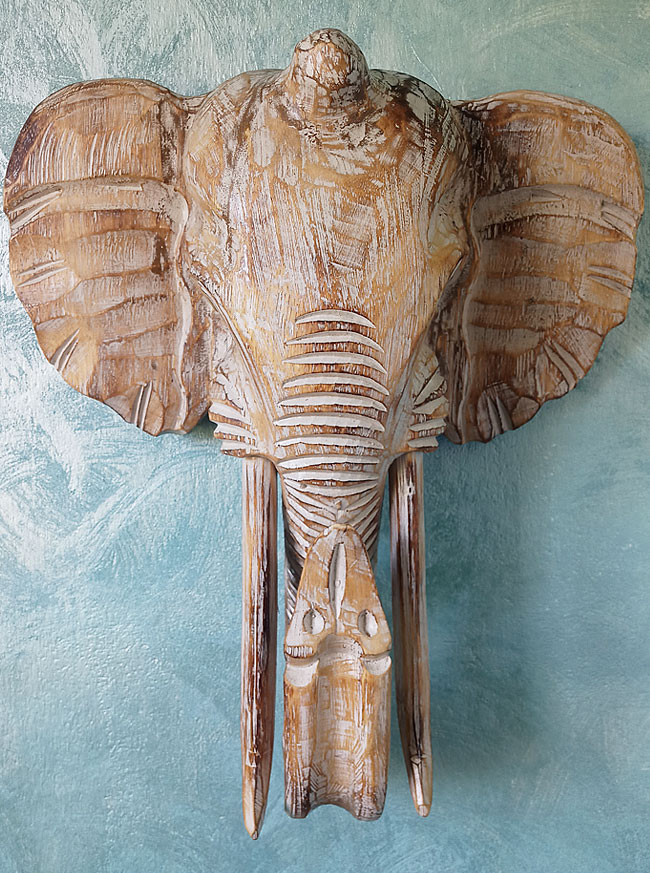 Strona główna » Dekoracje wnętrz i ogrodu » Maski z drewna, Dekoracje ścian » Dekoracje ścian 35- 55 cm » Rzeźba Maska Głowa SŁOŃ Drewno - Rękodzieło 40cm Beż/Brąz/Biały