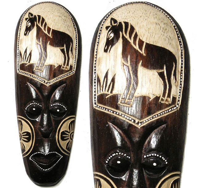 Strona główna » Dekoracje wnętrz i ogrodu » Maski z drewna, Dekoracje ścian » Rzeźba Maska z Drewna Etniczna z Koniem 30cm